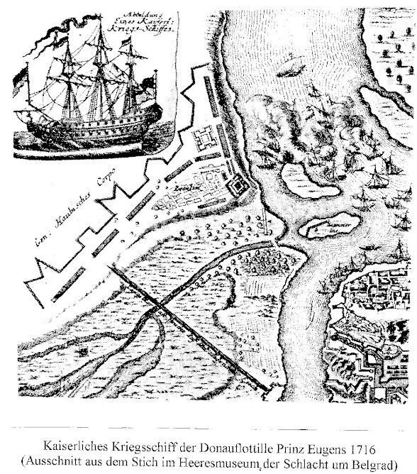 Nach dem Abbrechen der Brücke bei Pancsova folgten die beiden Fregatten "St. Leopoldus" und "St. Carolus" aufwärts und postierten sich zum Schutze des Brückenschlages zwischen Belgrad und der Brückenschlagstelle.